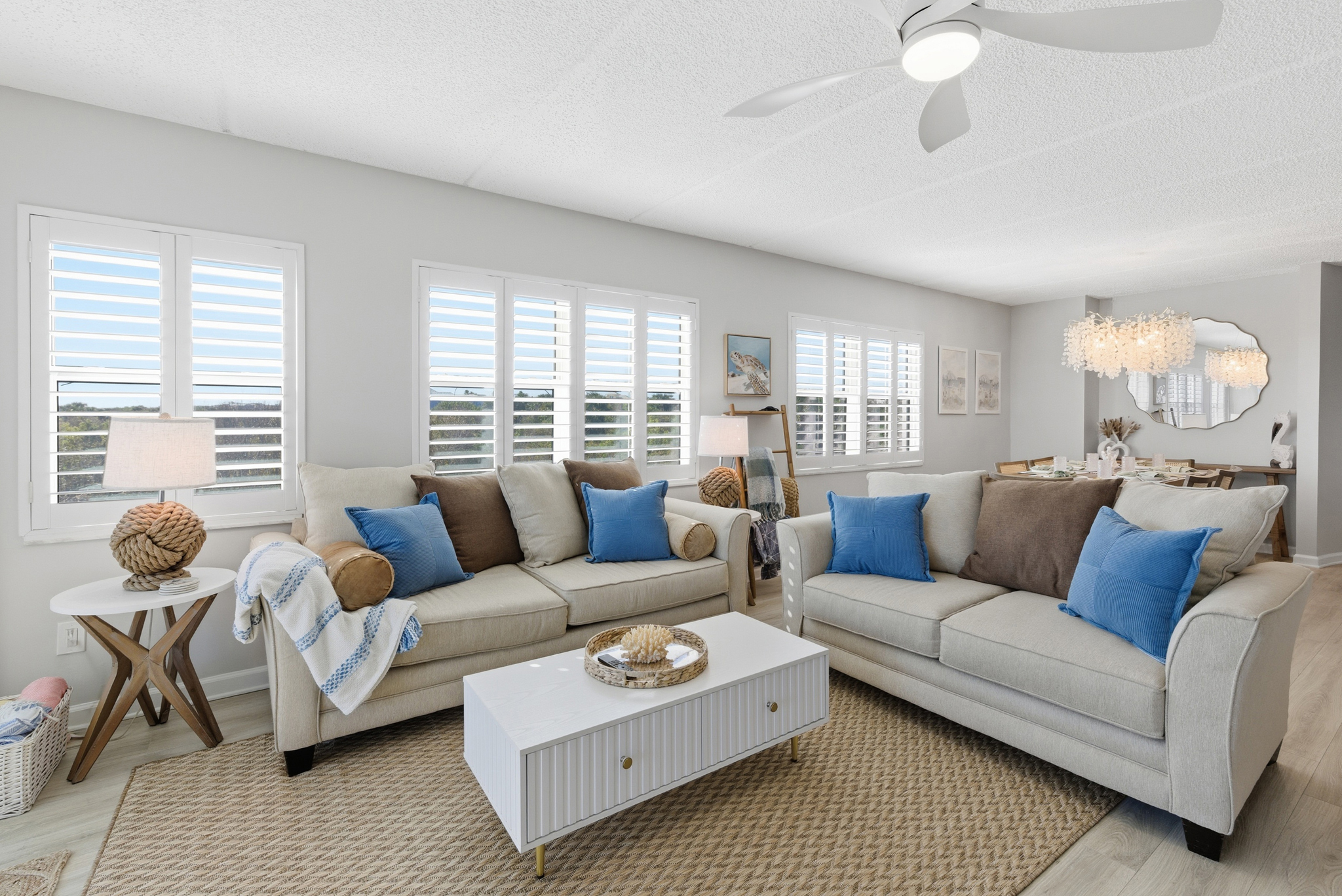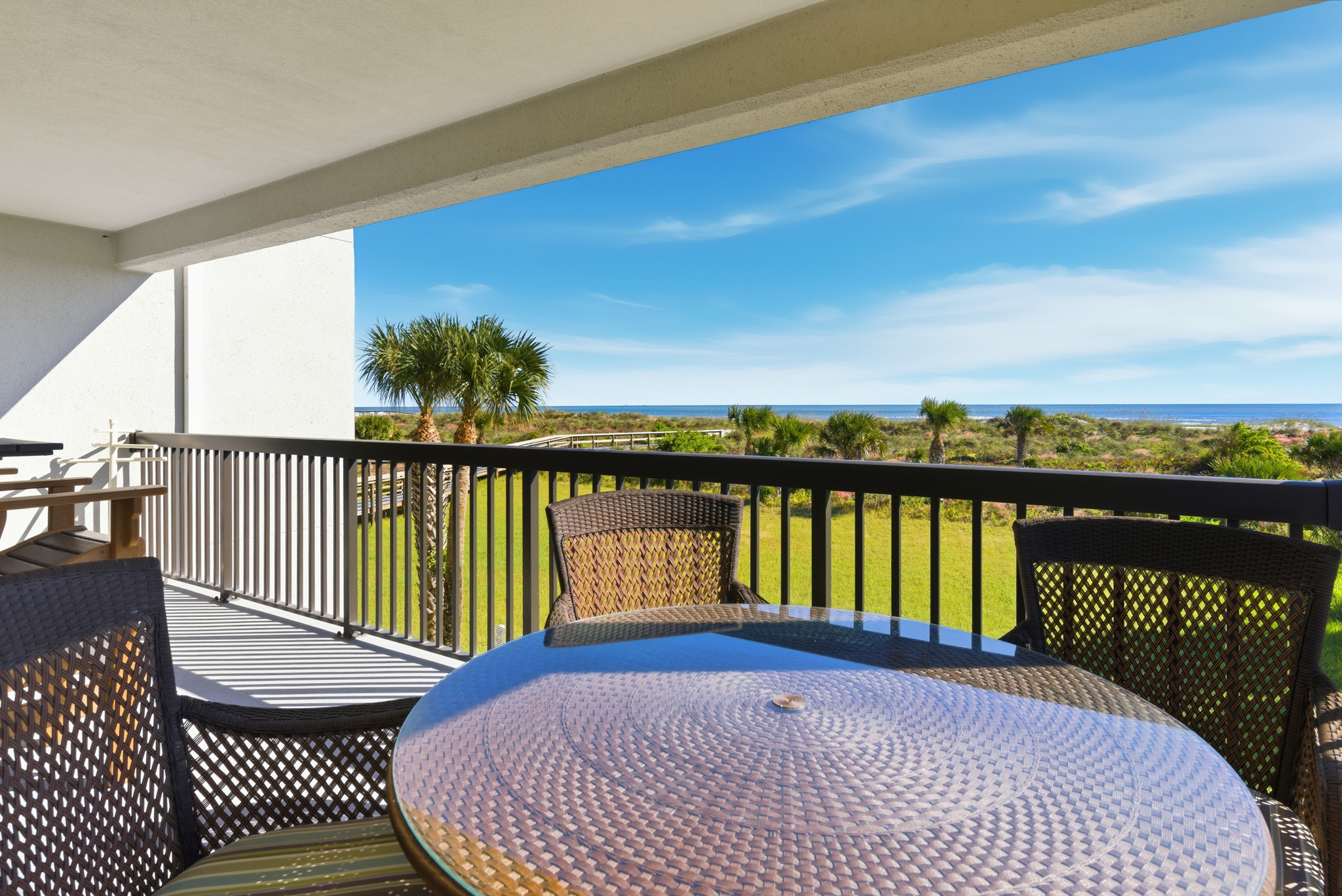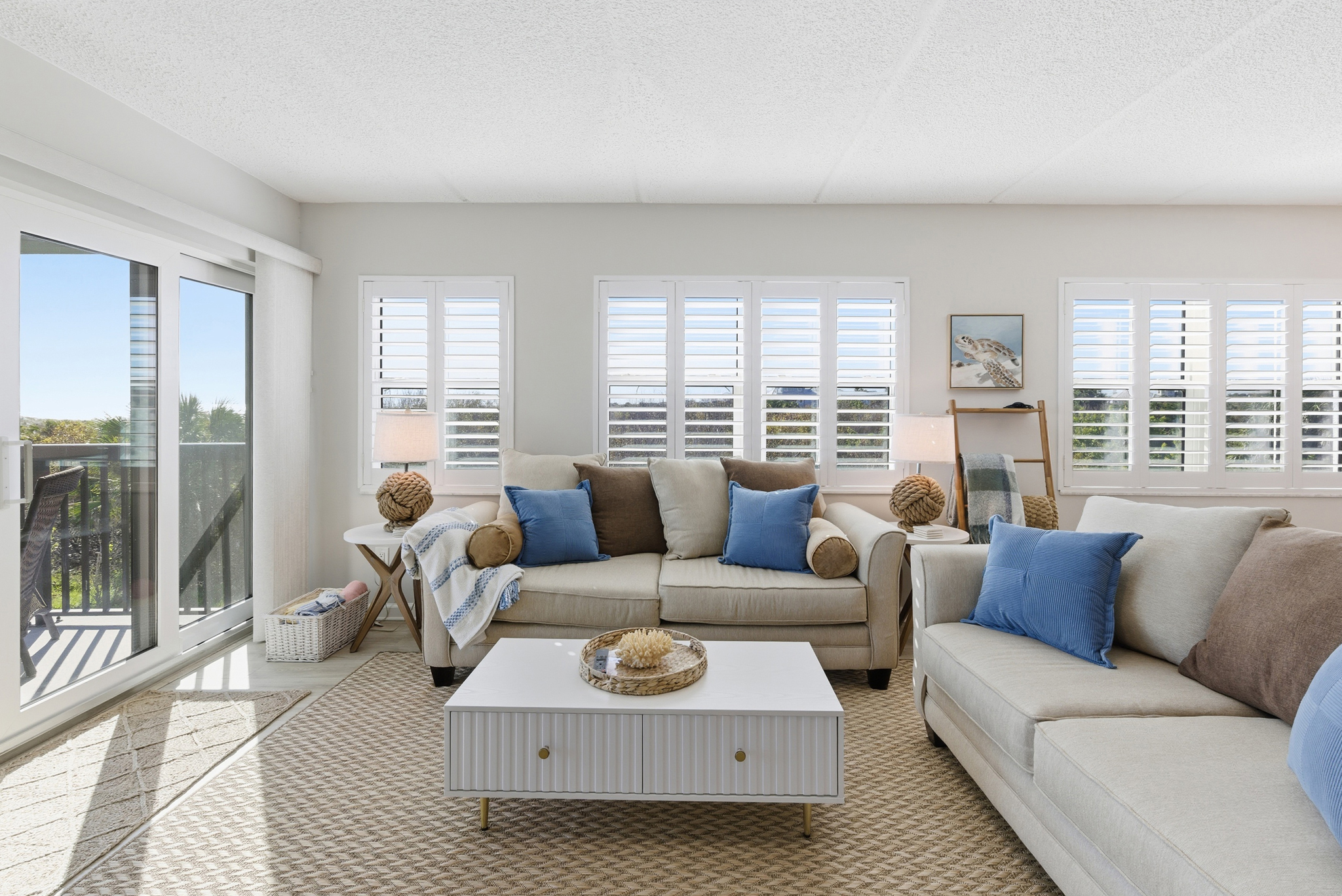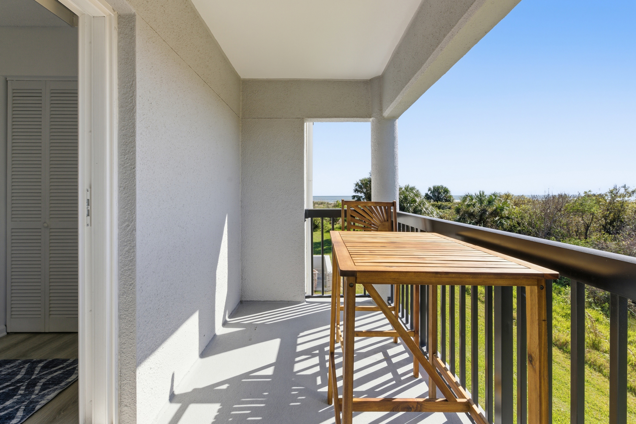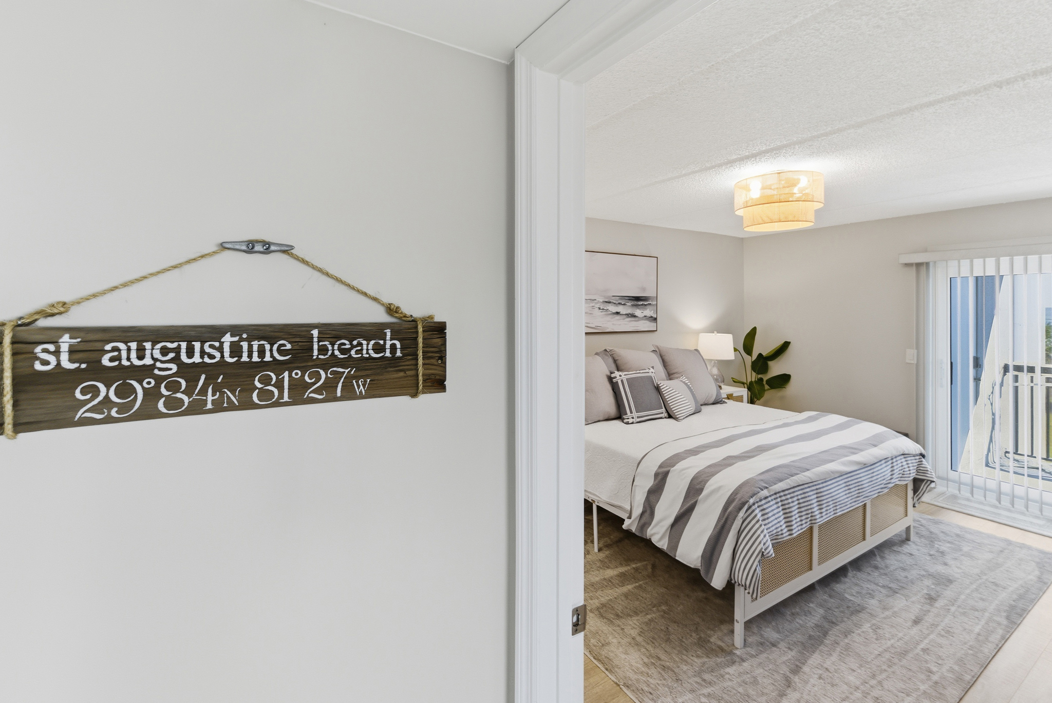 Welcome to Bermuda Run! A quiet and peaceful private gated community on St. Augustine Beach. This beautiful second floor unit offers stunning direct oceanfront views from every room. This unit has been tastefully updated with comfortable furnishings and designer touches throughout. The spacious living/dining combo provides ample space to comfortably enjoy the stunning views and has direct access to the large private oceanfront balcony. The dining table seats six and the roomy kitchen is fully equipped to prepare your favorite meals and has bar seating for four. The primary bedroom has a king bed, smart TV, ceiling fan, direct access to the private balcony and an en-suite bathroom with walk in shower. The second bedroom has a queen bed, ceiling fan, smart TV and access to a second balcony with ocean views. The third bedroom has a bunk bed with pull out trundle, ceiling fan and access to the second balcony. There is a hall bath with a shower/tub combo shared by the second and third bedrooms. Other features include a laundry room with full size washer and dryer, porta crib, highchair, children's books, children's dishes and sippy cups, exterior ground level storage with beach chairs and other beach supplies and a community pool. Many great dining and shopping opportunities near by. Ten minutes to historic downtown St. Augustine. 2 night minimum during the off season and a week during summer. No smoking. No pets.
