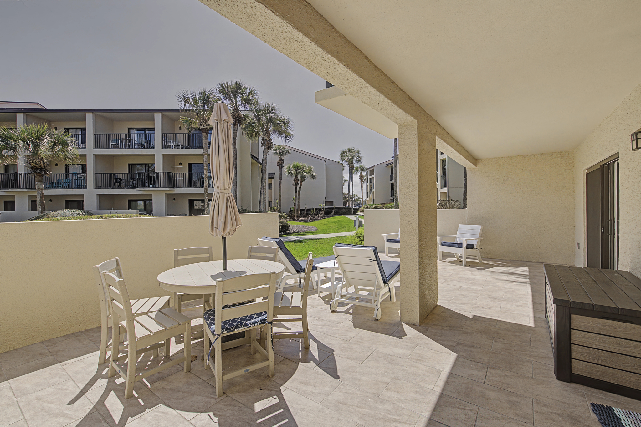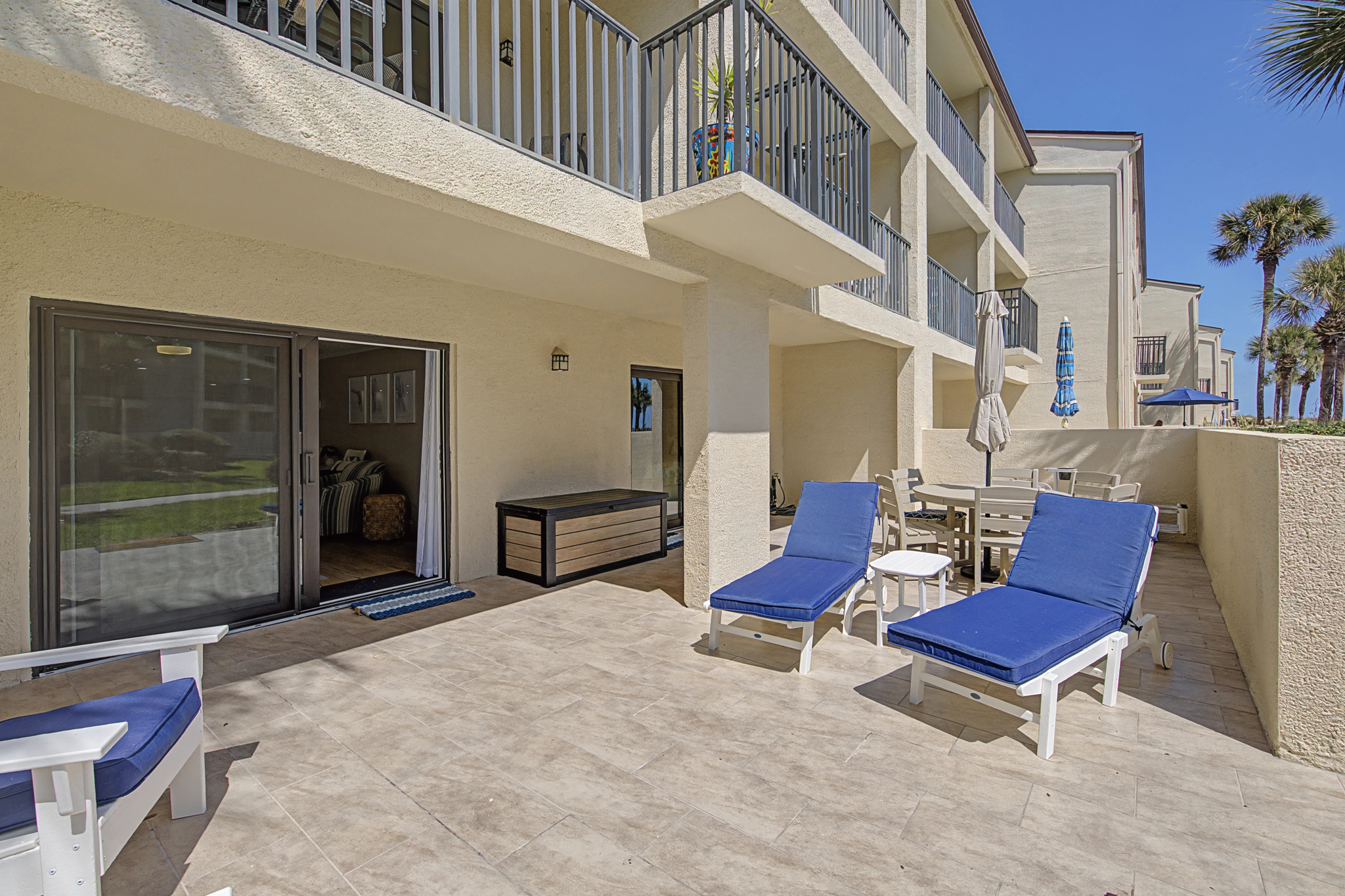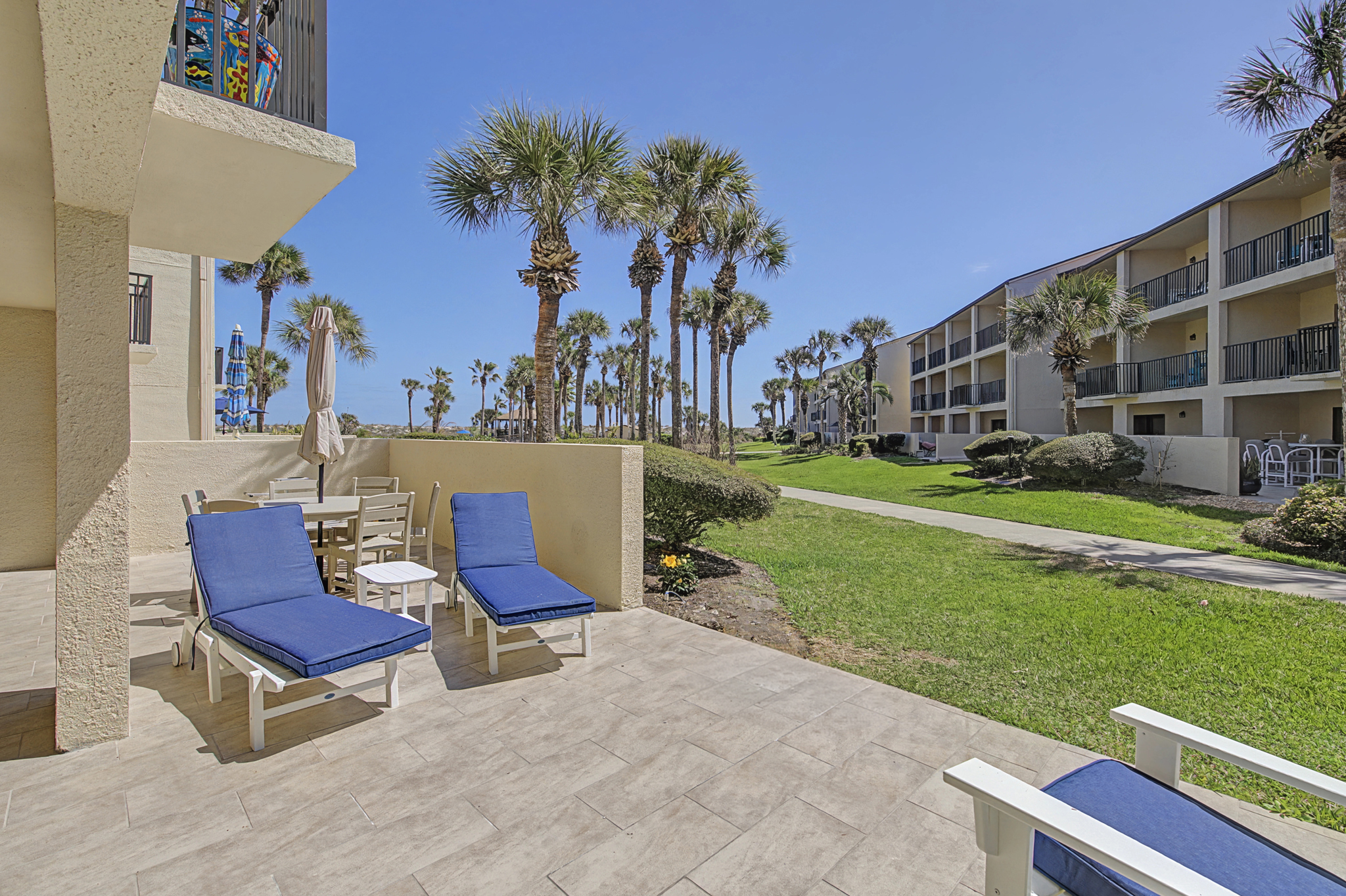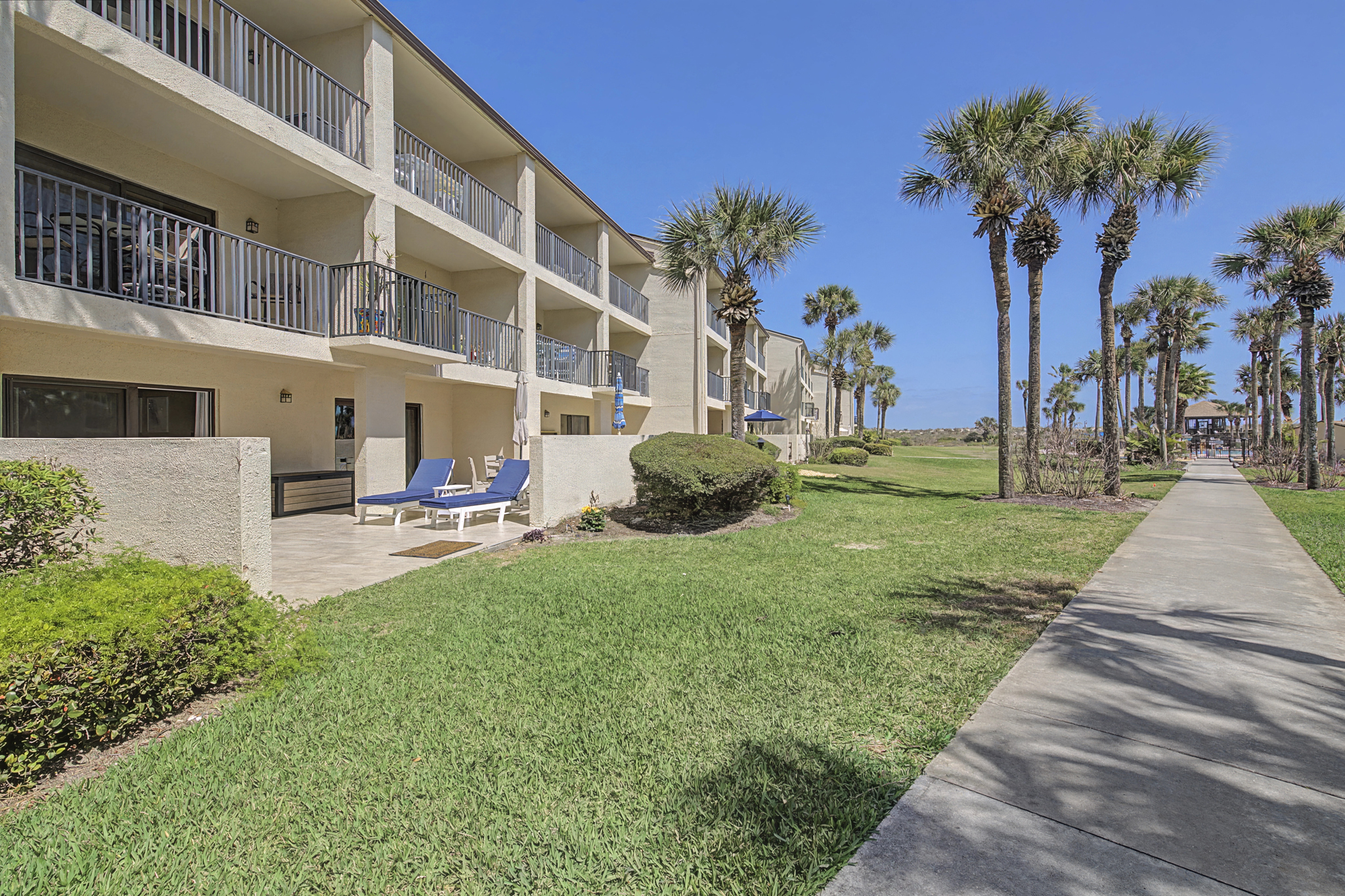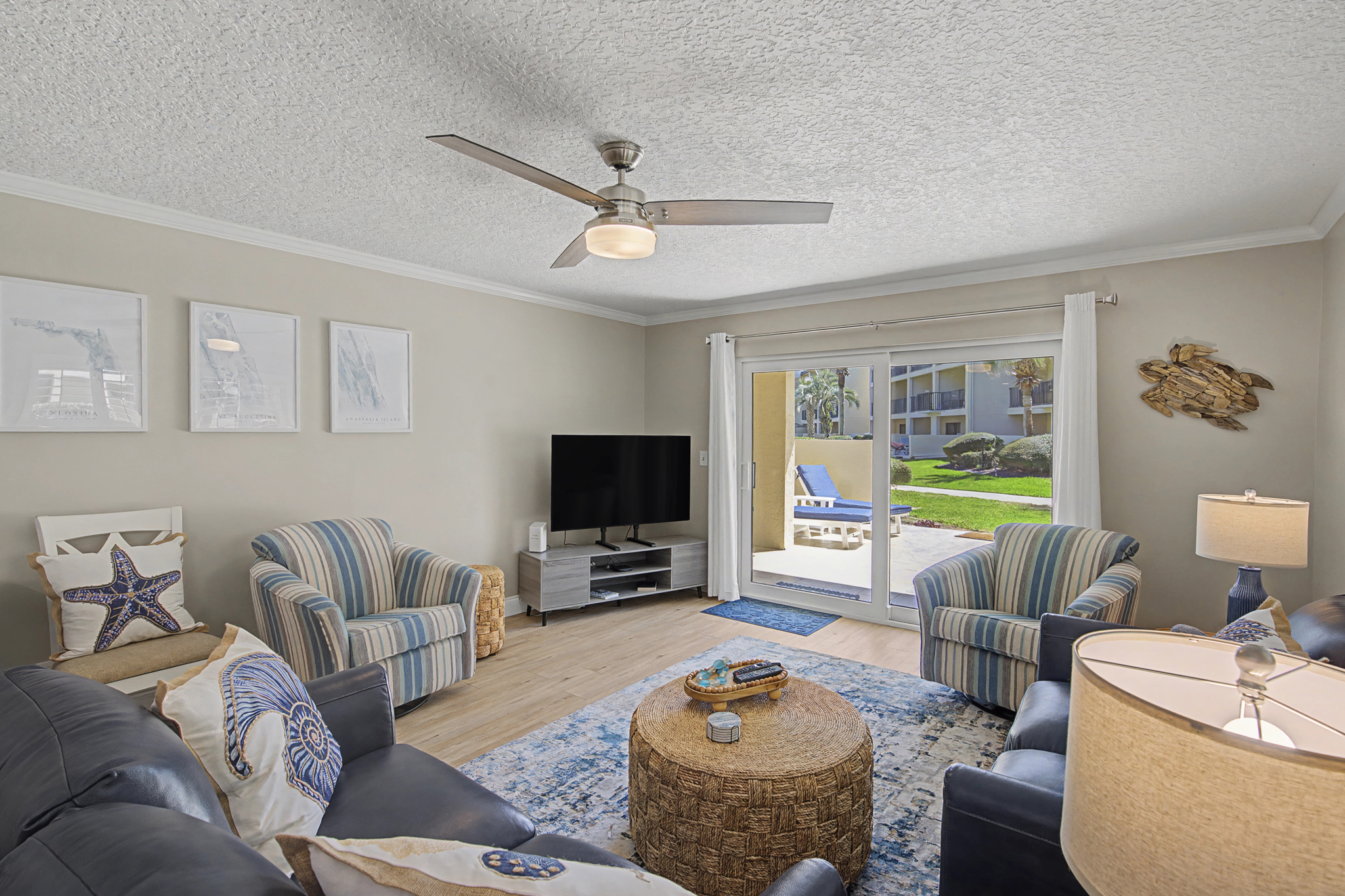 This ground floor end unit three bedroom two bath condo is located in the highly sought after ocean courtyard area at Ocean Villas and provides quick and easy access to the oceanside pool and community beach access. Also in close proximity to the beautiful tropical lagoon pool that is heated during winter months. A full renovation from the studs out has just been completed with beautiful designer touches throughout. All new comfortable, high quality furnishings and decor throughout. The spacious living area provides direct access to the oversize patio and has a ceiling fan, smart tv and the additional windows offered by being an end unit allowing ample natural light. There is bar seating for four at the kitchen island as well as a small dining table with seating for two. The primary bedroom has a king bed, ceiling fan, shiplap accent, direct access to the patio and a beautiful en-suite bathroom with a walk in shower. The second bedroom also has a king bed, ceiling fan and shares a hall bathroom just outside it's entrance. The third bedroom has a queen bed, ceiling fan and access to the front glass enclosed atrium with a sofa and TV offering a perfect room for the kids to enjoy gaming and other recreation. Other features include a full size washer and dryer, LVP flooring throughout, a beach cart, fully equipped kitchen, linens and towels provided. Ocean Villas is centrally located on St. Augustine Beach and in easy walking or biking distance to many shopping and dining options. Approximately ten minutes to historic downtown St. Augustine, The St. Augustine Amphitheatre and The Alligator Farm. No smoking. No pets.