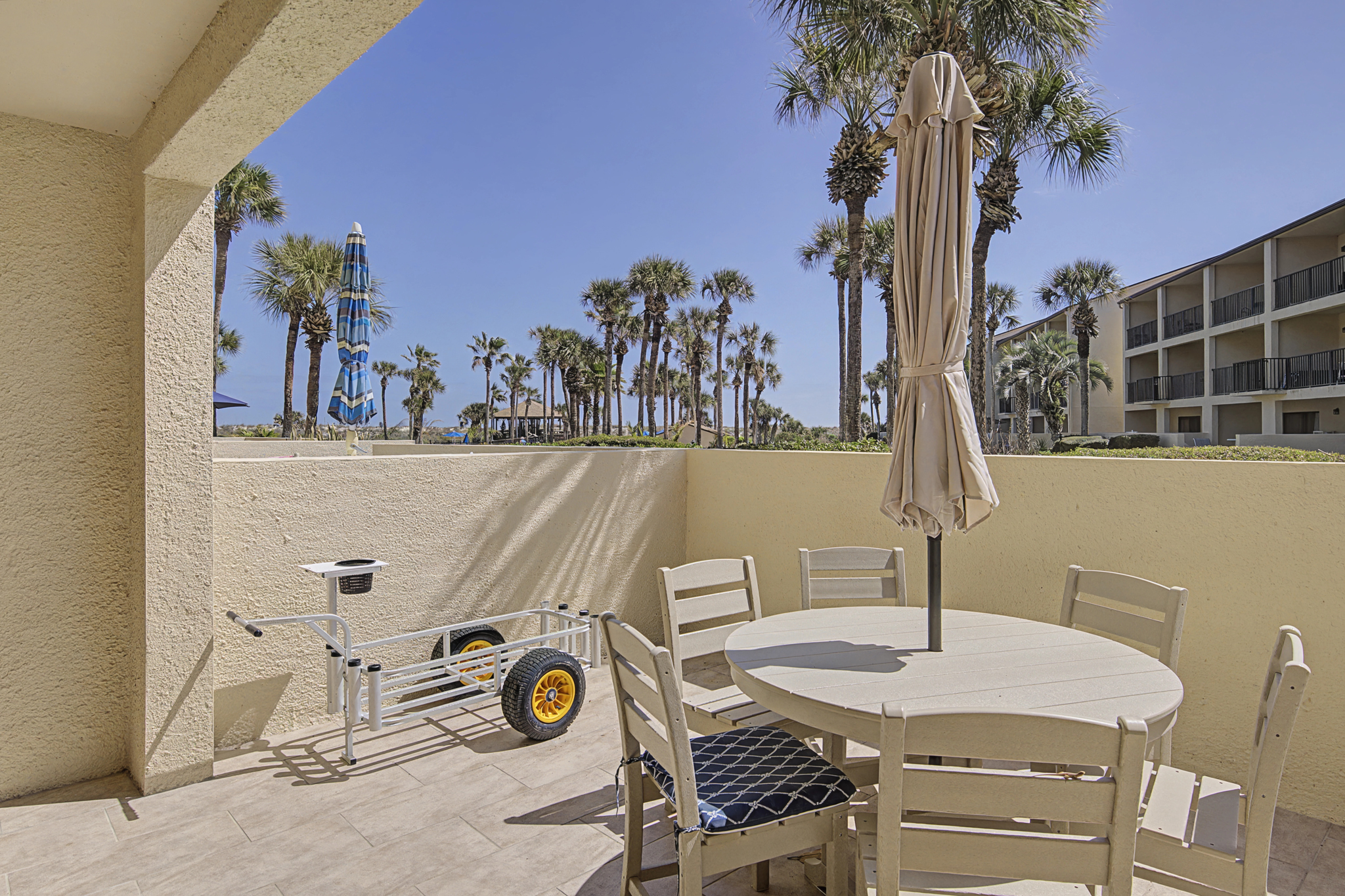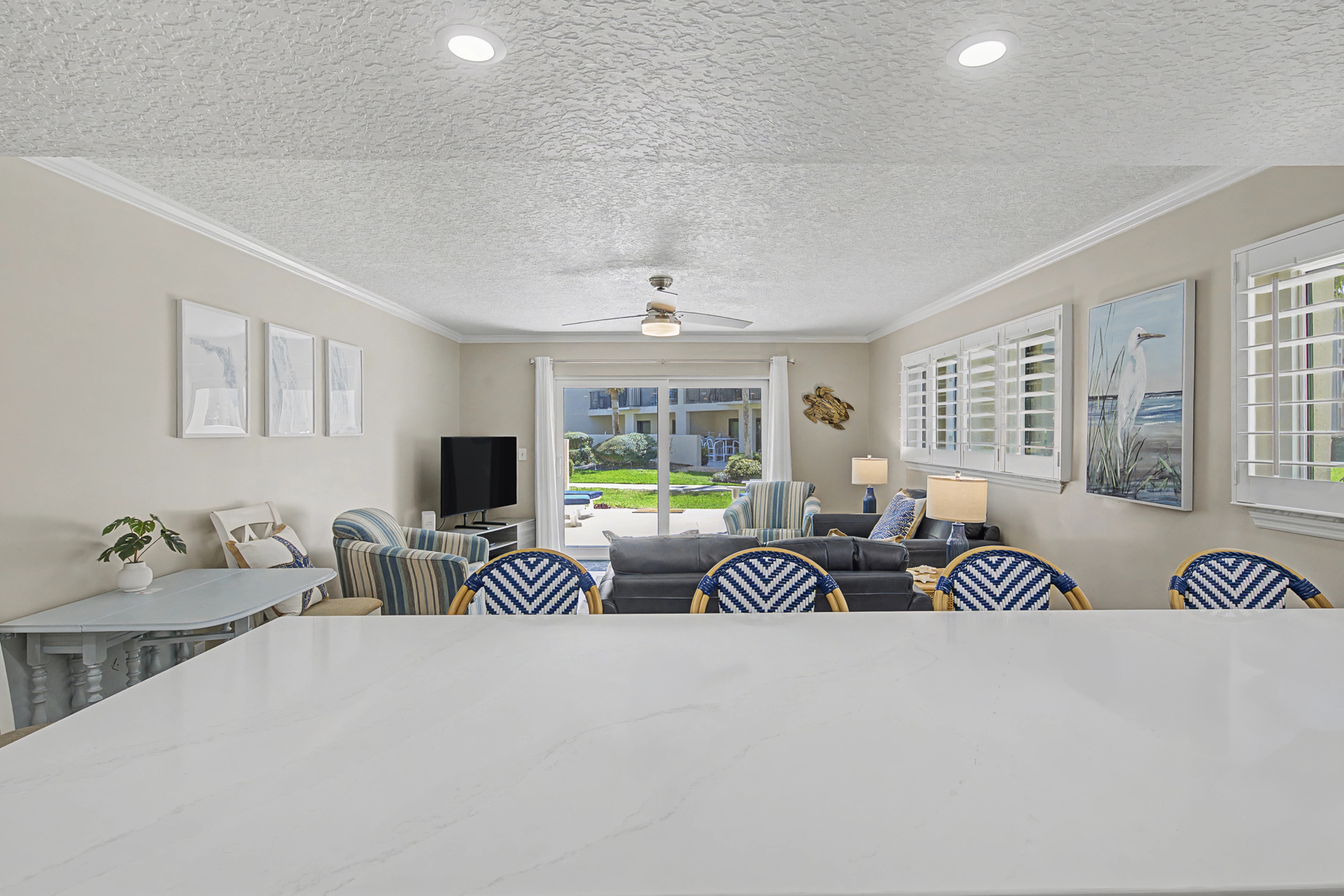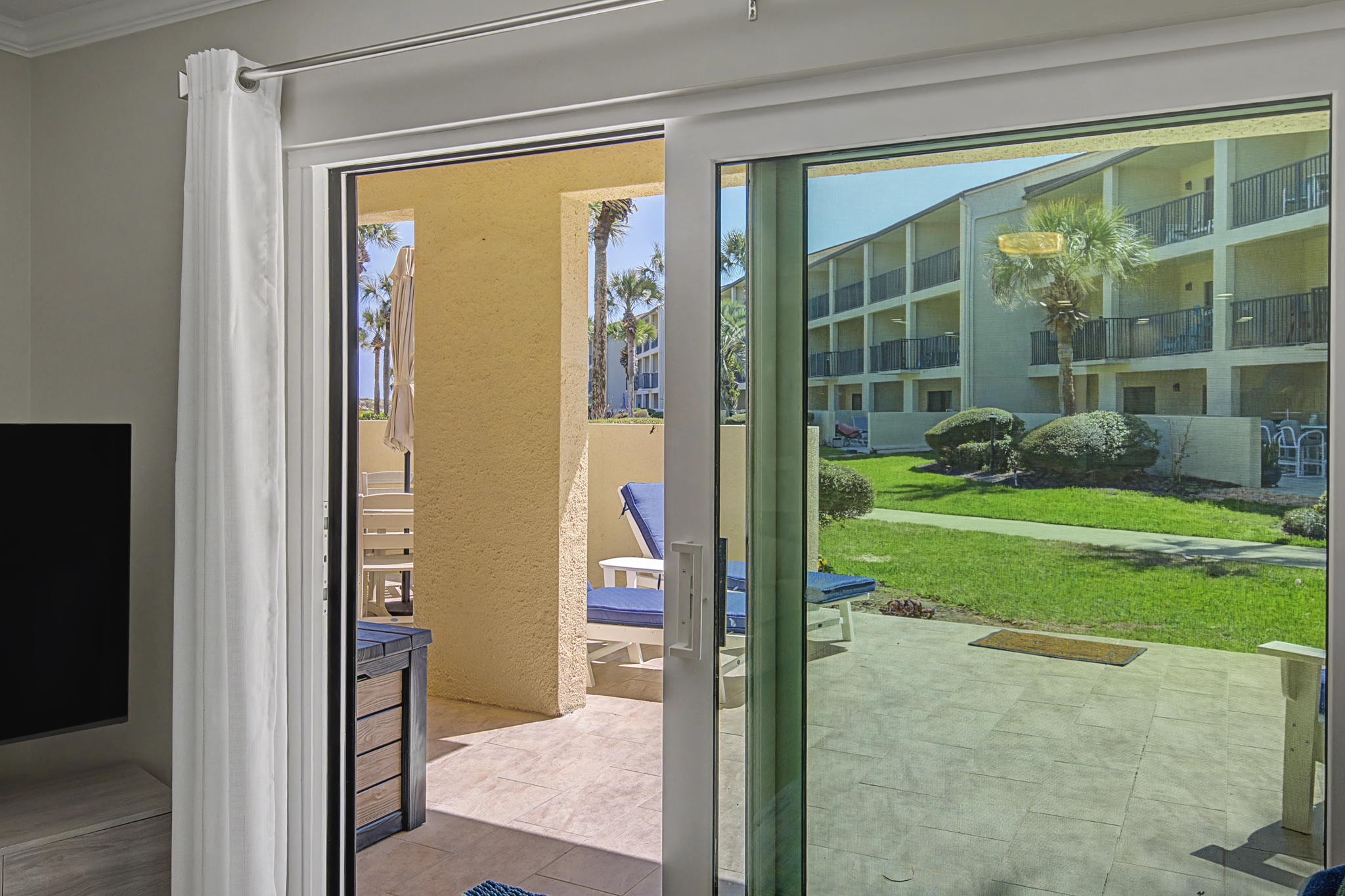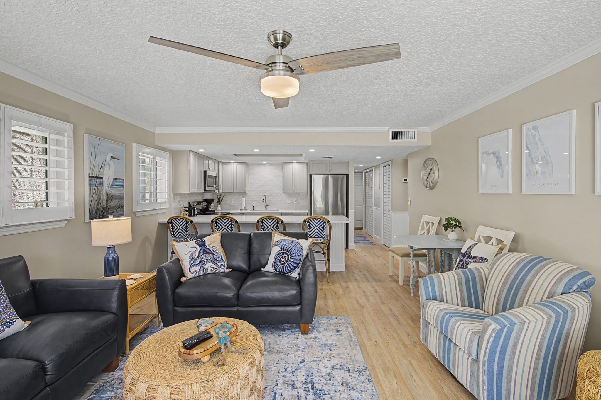 This ground floor end unit three bedroom two bath condo is located in the highly sought after ocean courtyard area at Ocean Villas and provides quick and easy access to the oceanside pool and community beach access. Also in close proximity to the beautiful tropical lagoon pool that is heated during winter months. A full renovation from the studs out has just been completed with beautiful designer touches throughout. All new comfortable, high quality furnishings and decor throughout. The spacious living area provides direct access to the oversize patio and has a ceiling fan, smart tv and the additional windows offered by being an end unit allowing ample natural light. There is bar seating for four at the kitchen island as well as a small dining table with seating for two. The primary bedroom has a king bed, ceiling fan, shiplap accent, direct access to the patio and a beautiful en-suite bathroom with a walk in shower. The second bedroom also has a king bed, ceiling fan and shares a hall bathroom just outside it's entrance. The third bedroom has a queen bed, ceiling fan and access to the front glass enclosed atrium with a sofa and TV offering a perfect room for the kids to enjoy gaming and other recreation. Other features include a full size washer and dryer, LVP flooring throughout, a beach cart, fully equipped kitchen, linens and towels provided. Ocean Villas is centrally located on St. Augustine Beach and in easy walking or biking distance to many shopping and dining options. Approximately ten minutes to historic downtown St. Augustine, The St. Augustine Amphitheatre and The Alligator Farm. No smoking. No pets.