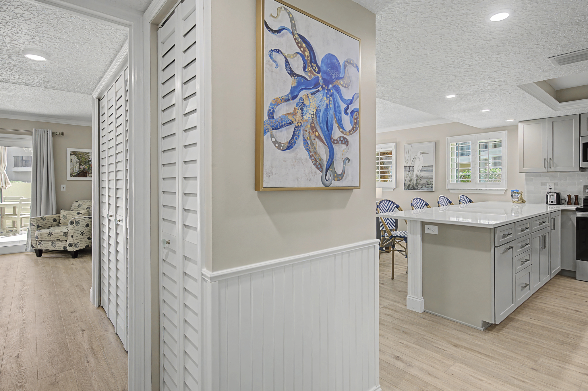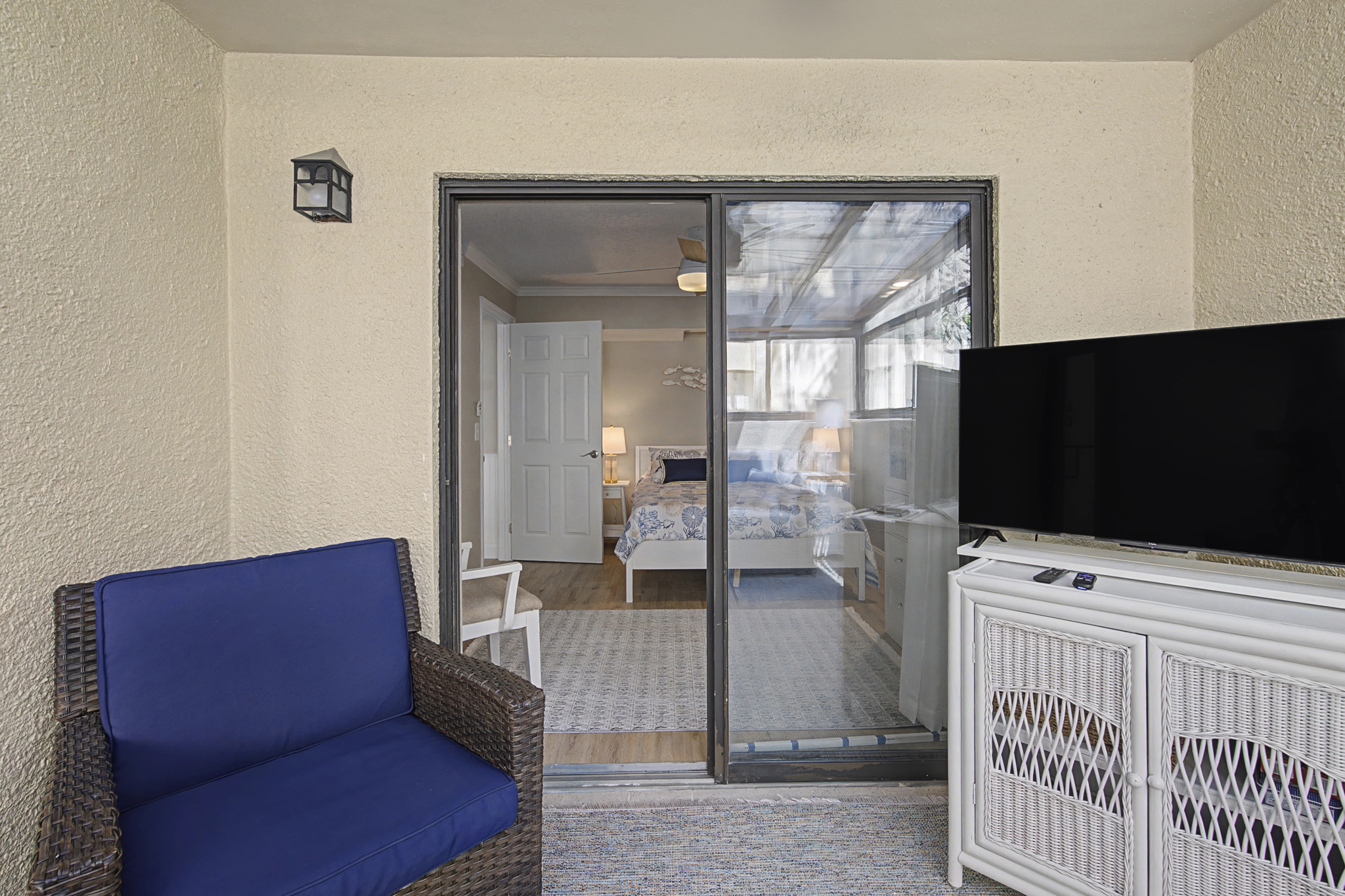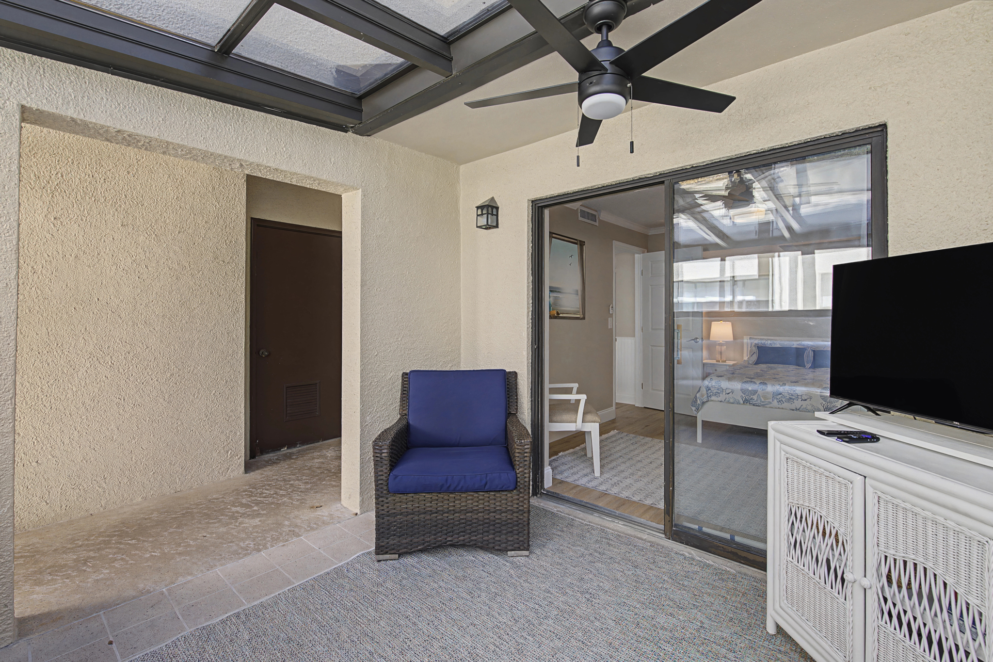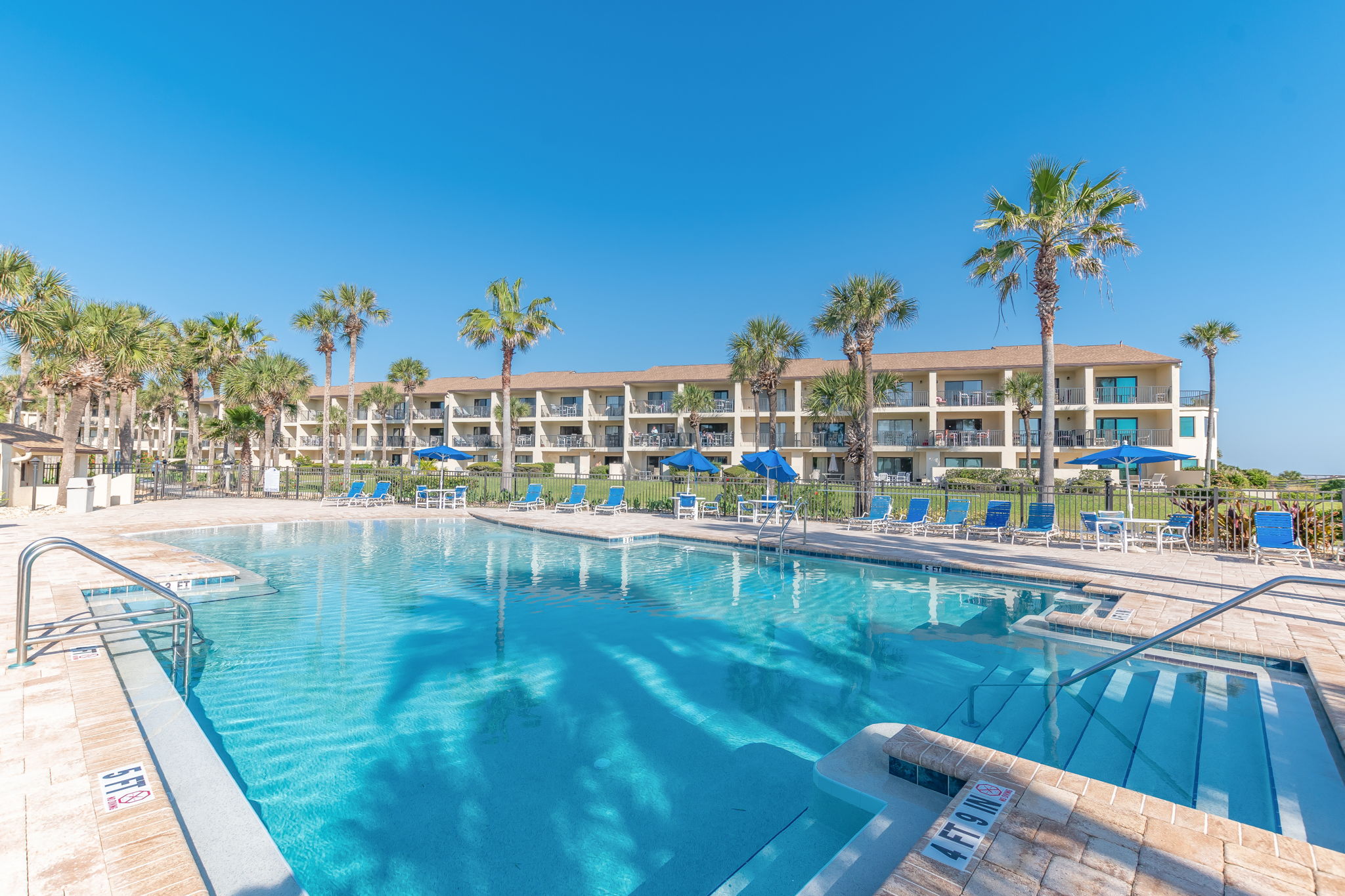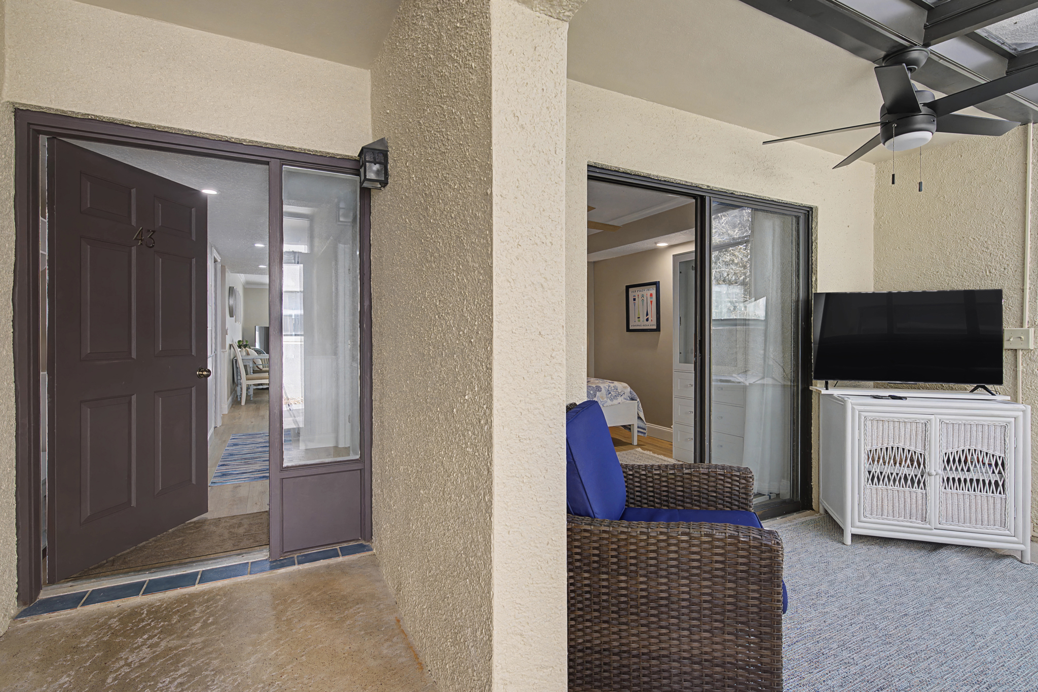 This ground floor end unit three bedroom two bath condo is located in the highly sought after ocean courtyard area at Ocean Villas and provides quick and easy access to the oceanside pool and community beach access. Also in close proximity to the beautiful tropical lagoon pool that is heated during winter months. A full renovation from the studs out has just been completed with beautiful designer touches throughout. All new comfortable, high quality furnishings and decor throughout. The spacious living area provides direct access to the oversize patio and has a ceiling fan, smart tv and the additional windows offered by being an end unit allowing ample natural light. There is bar seating for four at the kitchen island as well as a small dining table with seating for two. The primary bedroom has a king bed, ceiling fan, shiplap accent, direct access to the patio and a beautiful en-suite bathroom with a walk in shower. The second bedroom also has a king bed, ceiling fan and shares a hall bathroom just outside it's entrance. The third bedroom has a queen bed, ceiling fan and access to the front glass enclosed atrium with a sofa and TV offering a perfect room for the kids to enjoy gaming and other recreation. Other features include a full size washer and dryer, LVP flooring throughout, a beach cart, fully equipped kitchen, linens and towels provided. Ocean Villas is centrally located on St. Augustine Beach and in easy walking or biking distance to many shopping and dining options. Approximately ten minutes to historic downtown St. Augustine, The St. Augustine Amphitheatre and The Alligator Farm. No smoking. No pets.