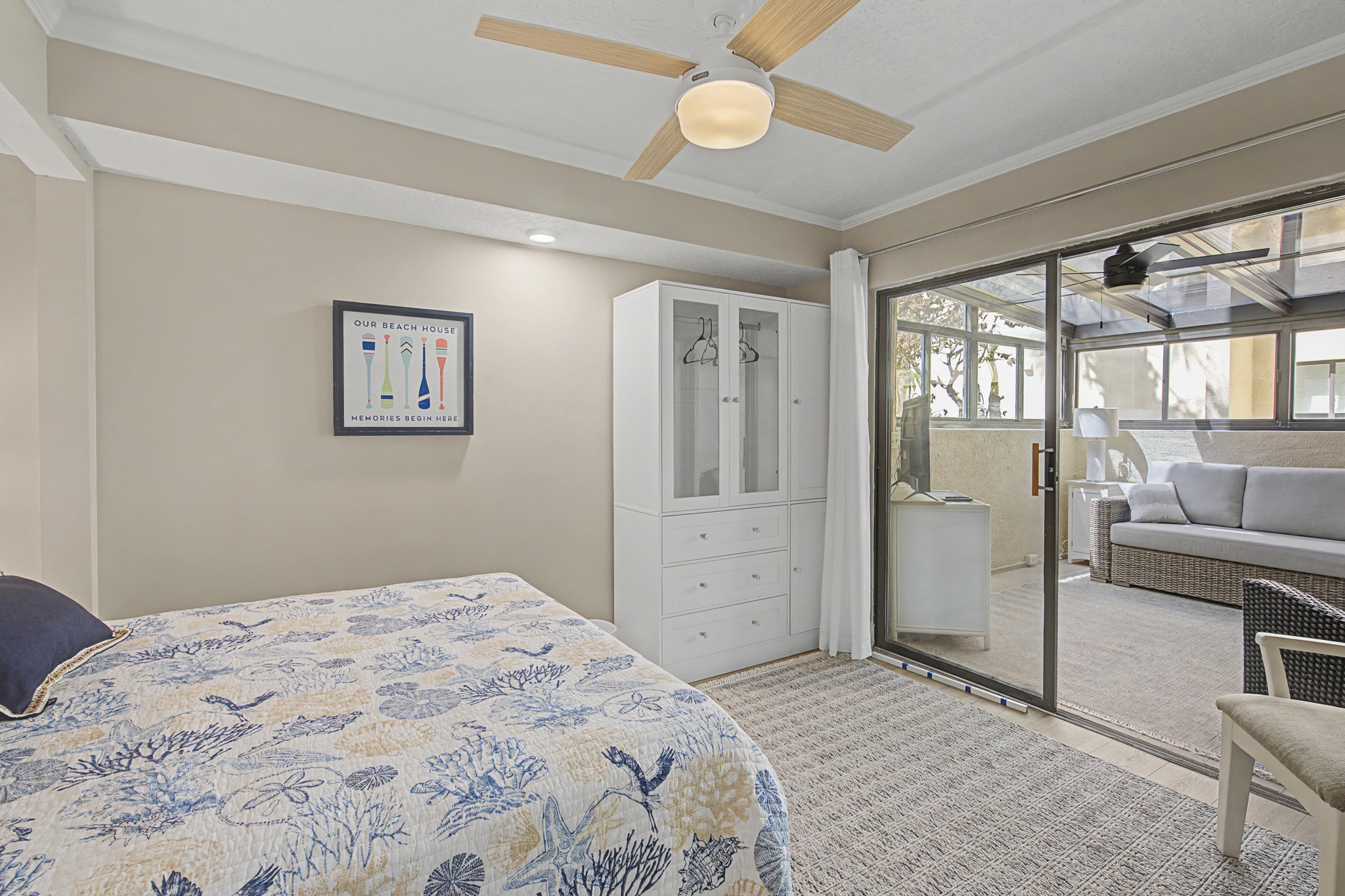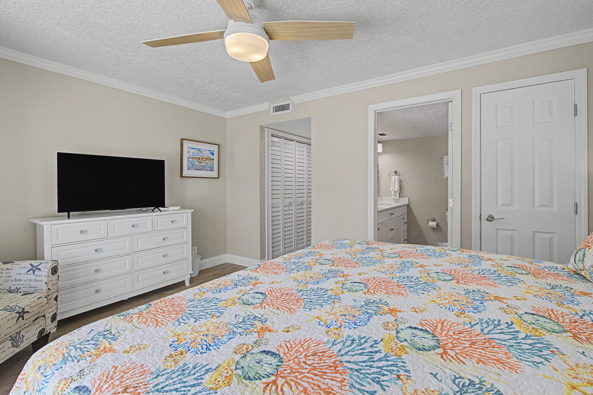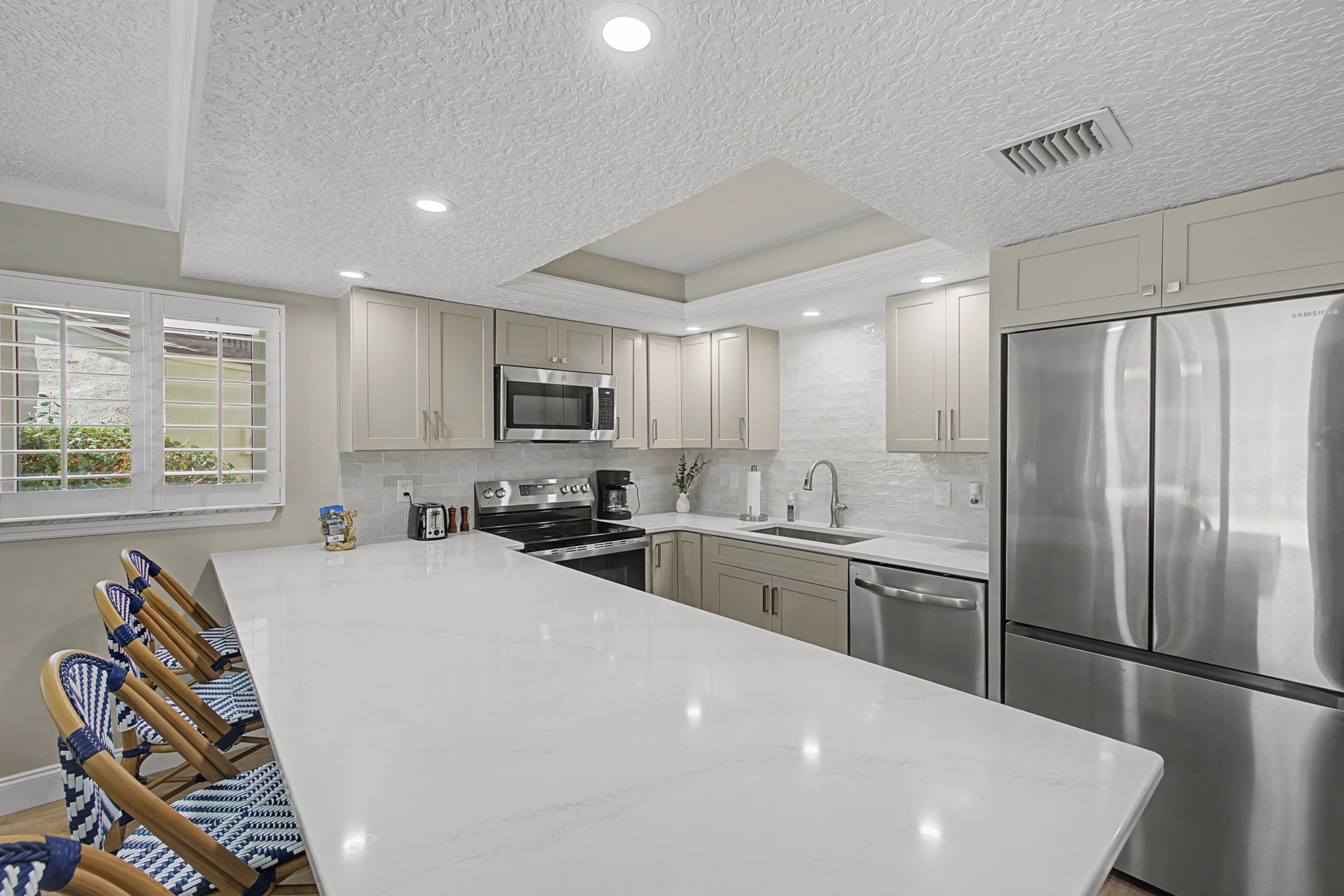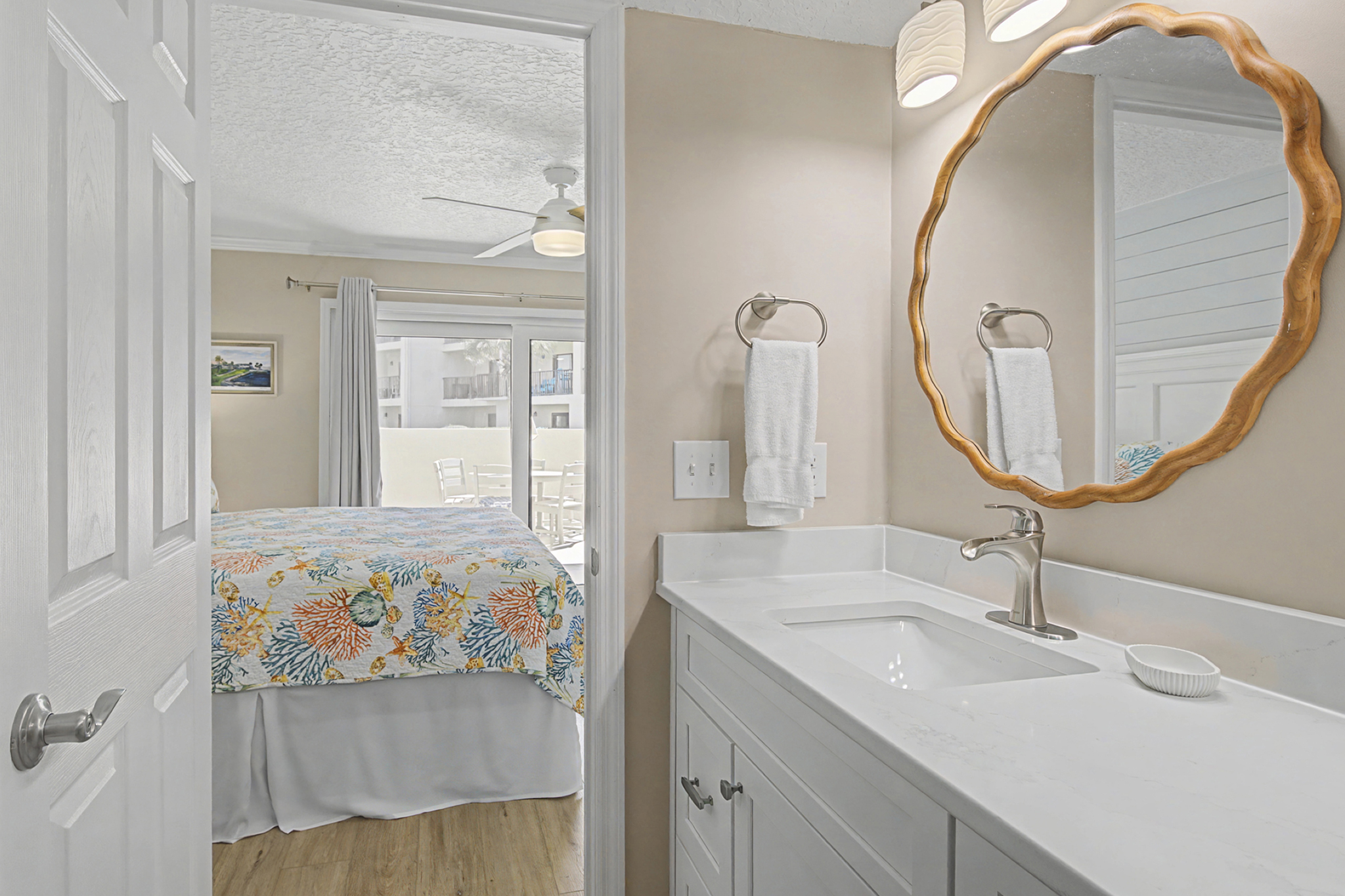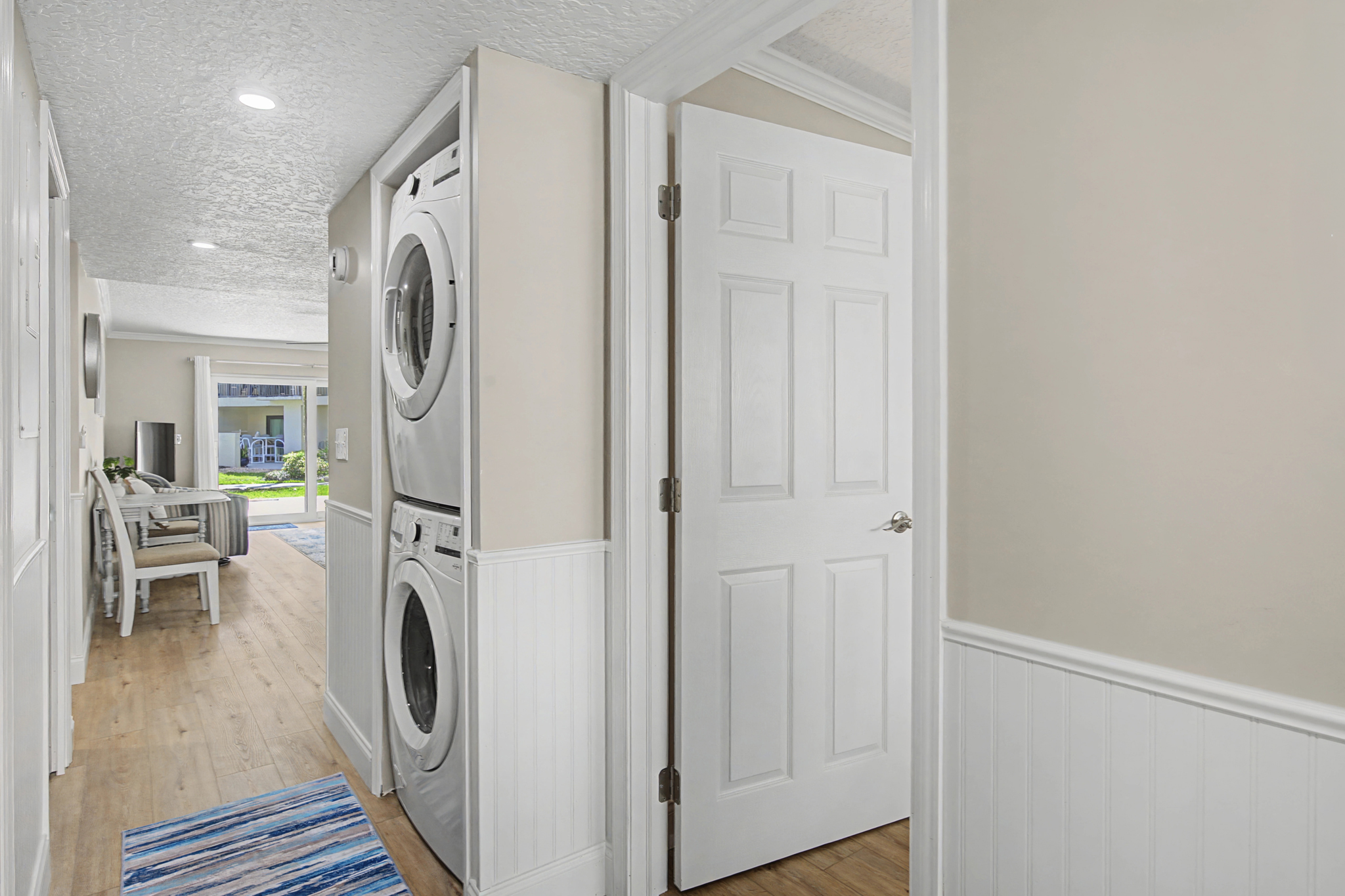 This ground floor end unit three bedroom two bath condo is located in the highly sought after ocean courtyard area at Ocean Villas and provides quick and easy access to the oceanside pool and community beach access. Also in close proximity to the beautiful tropical lagoon pool that is heated during winter months. A full renovation from the studs out has just been completed with beautiful designer touches throughout. All new comfortable, high quality furnishings and decor throughout. The spacious living area provides direct access to the oversize patio and has a ceiling fan, smart tv and the additional windows offered by being an end unit allowing ample natural light. There is bar seating for four at the kitchen island as well as a small dining table with seating for two. The primary bedroom has a king bed, ceiling fan, shiplap accent, direct access to the patio and a beautiful en-suite bathroom with a walk in shower. The second bedroom also has a king bed, ceiling fan and shares a hall bathroom just outside it's entrance. The third bedroom has a queen bed, ceiling fan and access to the front glass enclosed atrium with a sofa and TV offering a perfect room for the kids to enjoy gaming and other recreation. Other features include a full size washer and dryer, LVP flooring throughout, a beach cart, fully equipped kitchen, linens and towels provided. Ocean Villas is centrally located on St. Augustine Beach and in easy walking or biking distance to many shopping and dining options. Approximately ten minutes to historic downtown St. Augustine, The St. Augustine Amphitheatre and The Alligator Farm. No smoking. No pets.