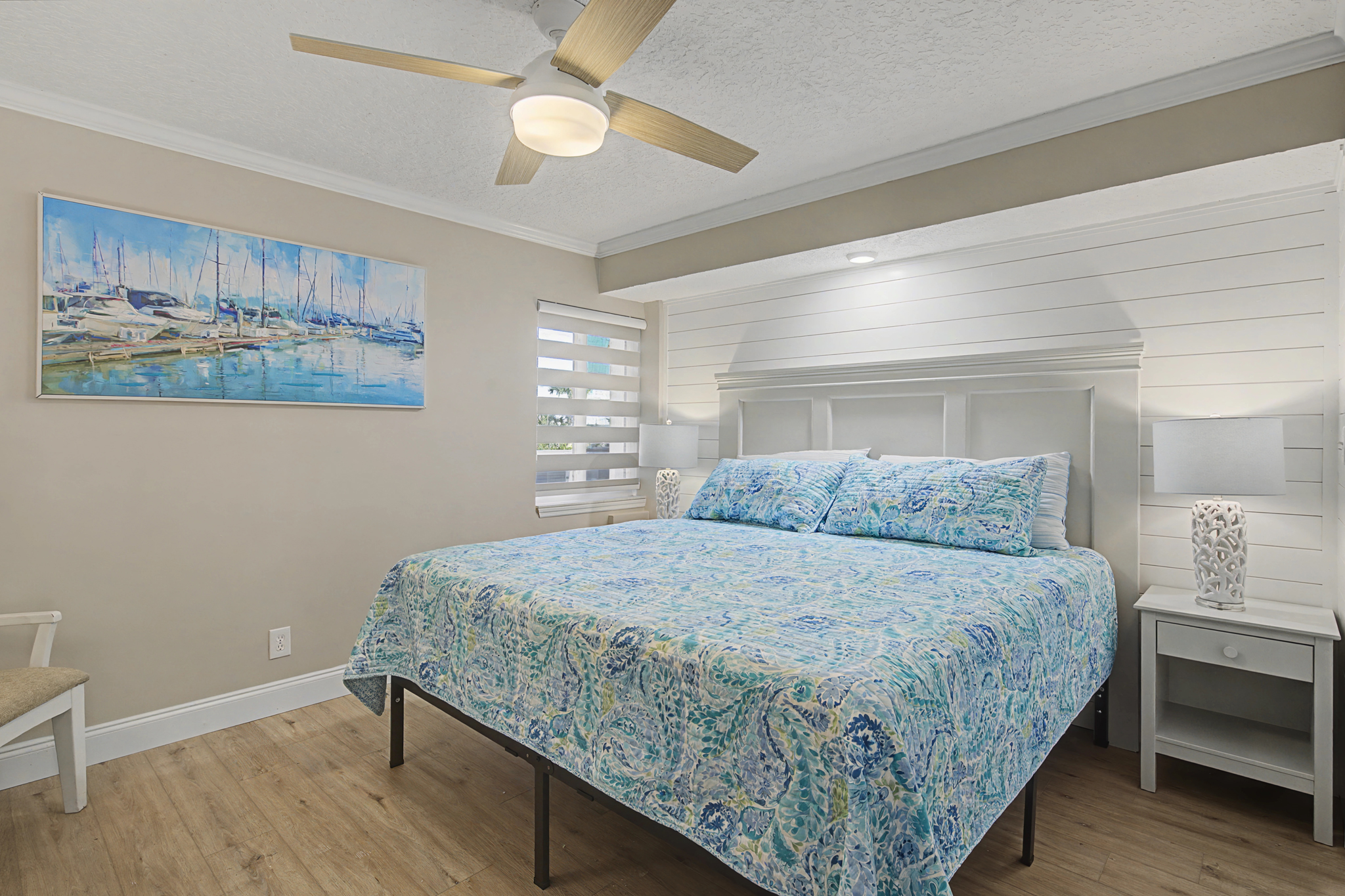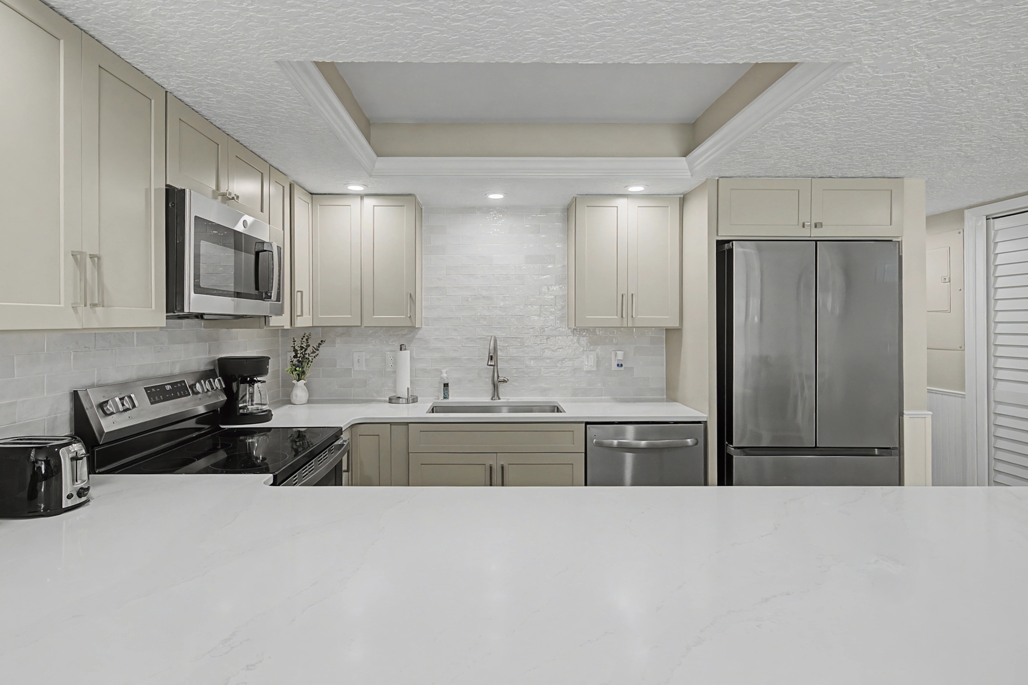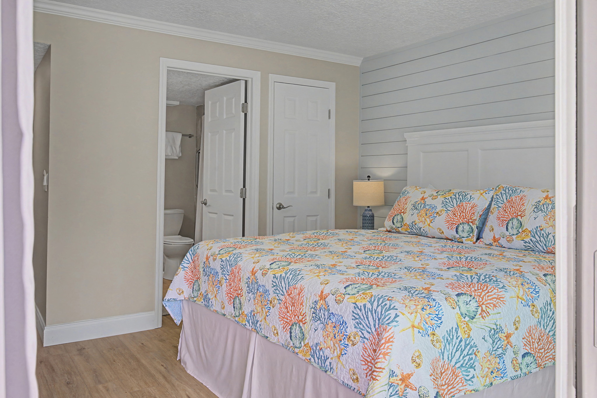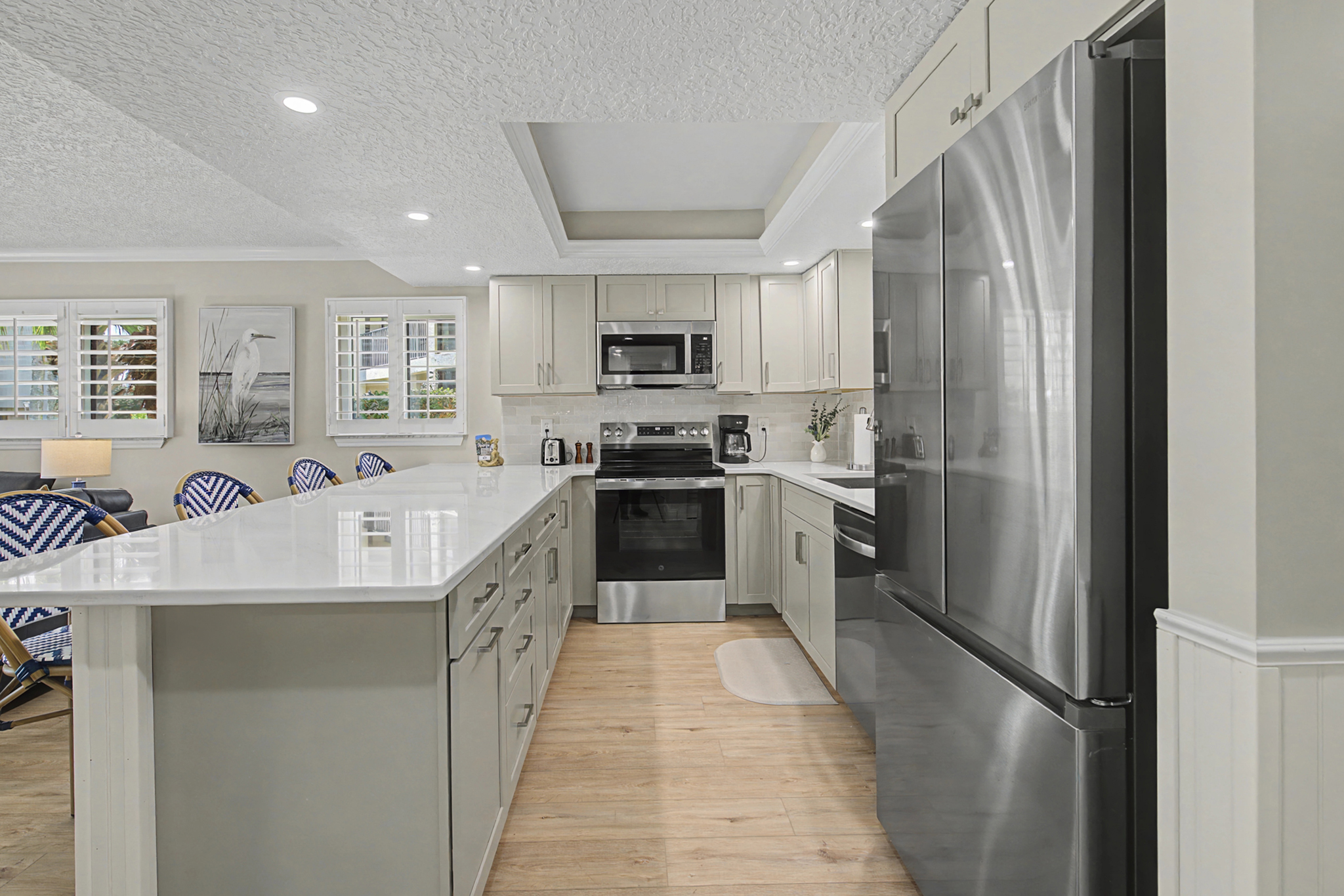 This ground floor end unit three bedroom two bath condo is located in the highly sought after ocean courtyard area at Ocean Villas and provides quick and easy access to the oceanside pool and community beach access. Also in close proximity to the beautiful tropical lagoon pool that is heated during winter months. A full renovation from the studs out has just been completed with beautiful designer touches throughout. All new comfortable, high quality furnishings and decor throughout. The spacious living area provides direct access to the oversize patio and has a ceiling fan, smart tv and the additional windows offered by being an end unit allowing ample natural light. There is bar seating for four at the kitchen island as well as a small dining table with seating for two. The primary bedroom has a king bed, ceiling fan, shiplap accent, direct access to the patio and a beautiful en-suite bathroom with a walk in shower. The second bedroom also has a king bed, ceiling fan and shares a hall bathroom just outside it's entrance. The third bedroom has a queen bed, ceiling fan and access to the front glass enclosed atrium with a sofa and TV offering a perfect room for the kids to enjoy gaming and other recreation. Other features include a full size washer and dryer, LVP flooring throughout, a beach cart, fully equipped kitchen, linens and towels provided. Ocean Villas is centrally located on St. Augustine Beach and in easy walking or biking distance to many shopping and dining options. Approximately ten minutes to historic downtown St. Augustine, The St. Augustine Amphitheatre and The Alligator Farm. No smoking. No pets.