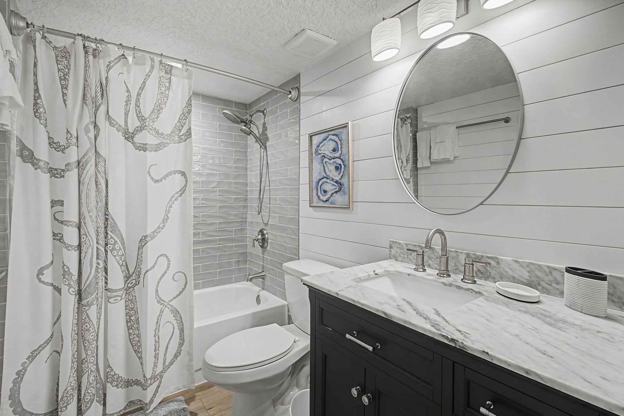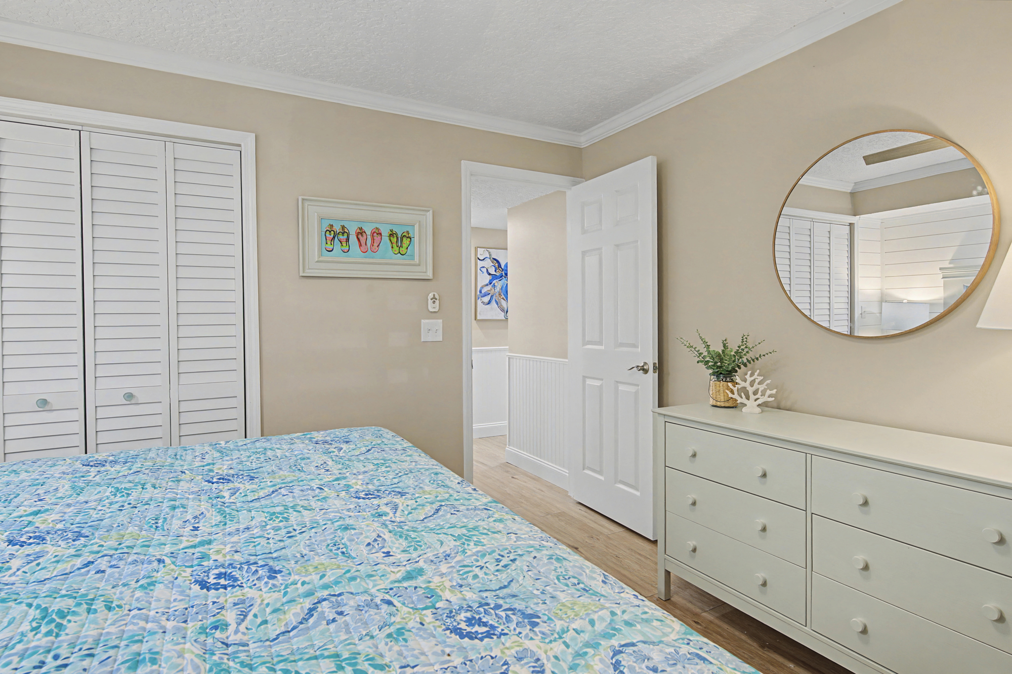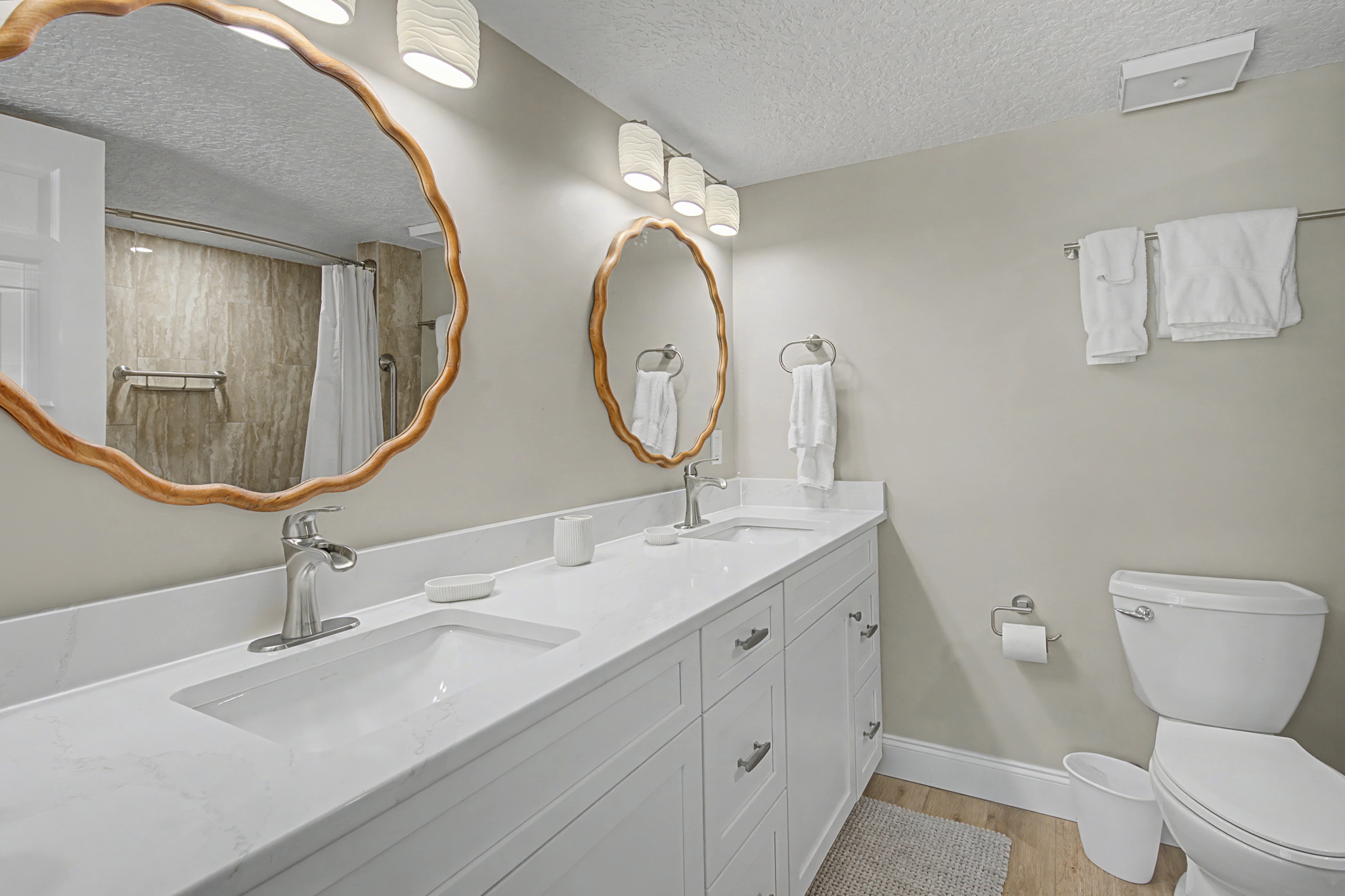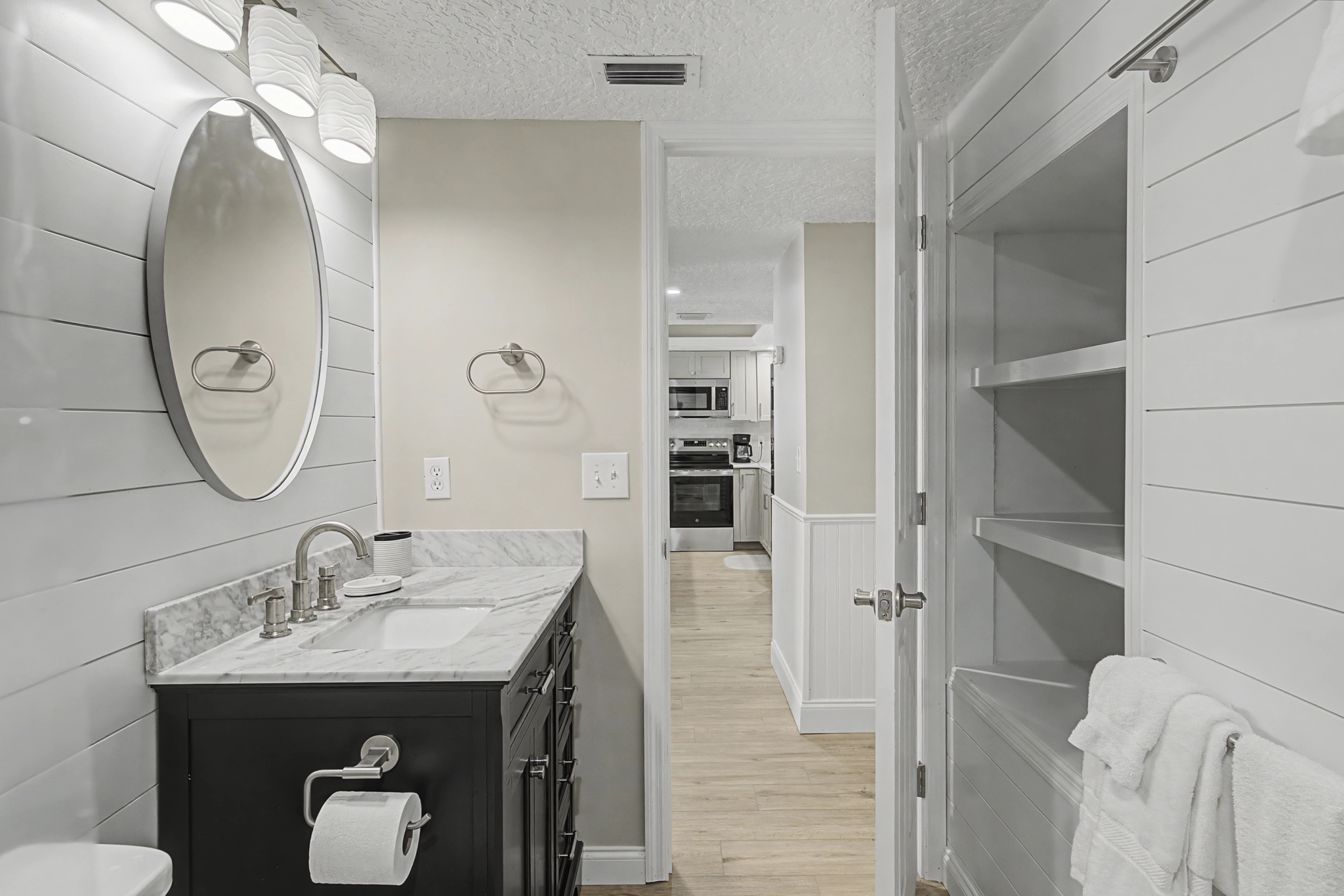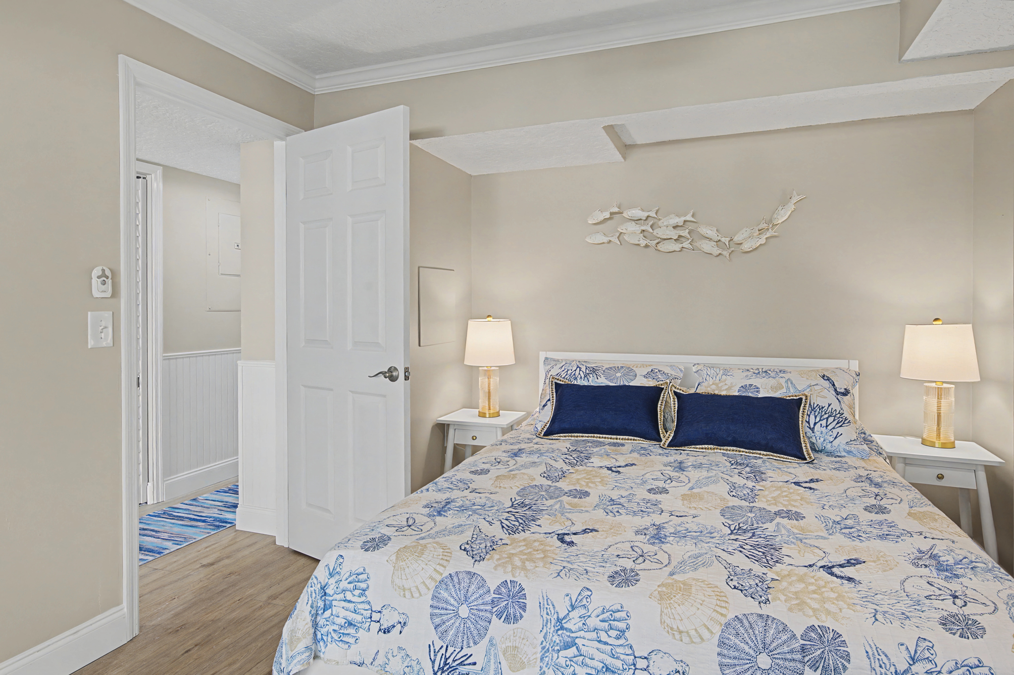 This ground floor end unit three bedroom two bath condo is located in the highly sought after ocean courtyard area at Ocean Villas and provides quick and easy access to the oceanside pool and community beach access. Also in close proximity to the beautiful tropical lagoon pool that is heated during winter months. A full renovation from the studs out has just been completed with beautiful designer touches throughout. All new comfortable, high quality furnishings and decor throughout. The spacious living area provides direct access to the oversize patio and has a ceiling fan, smart tv and the additional windows offered by being an end unit allowing ample natural light. There is bar seating for four at the kitchen island as well as a small dining table with seating for two. The primary bedroom has a king bed, ceiling fan, shiplap accent, direct access to the patio and a beautiful en-suite bathroom with a walk in shower. The second bedroom also has a king bed, ceiling fan and shares a hall bathroom just outside it's entrance. The third bedroom has a queen bed, ceiling fan and access to the front glass enclosed atrium with a sofa and TV offering a perfect room for the kids to enjoy gaming and other recreation. Other features include a full size washer and dryer, LVP flooring throughout, a beach cart, fully equipped kitchen, linens and towels provided. Ocean Villas is centrally located on St. Augustine Beach and in easy walking or biking distance to many shopping and dining options. Approximately ten minutes to historic downtown St. Augustine, The St. Augustine Amphitheatre and The Alligator Farm. No smoking. No pets.