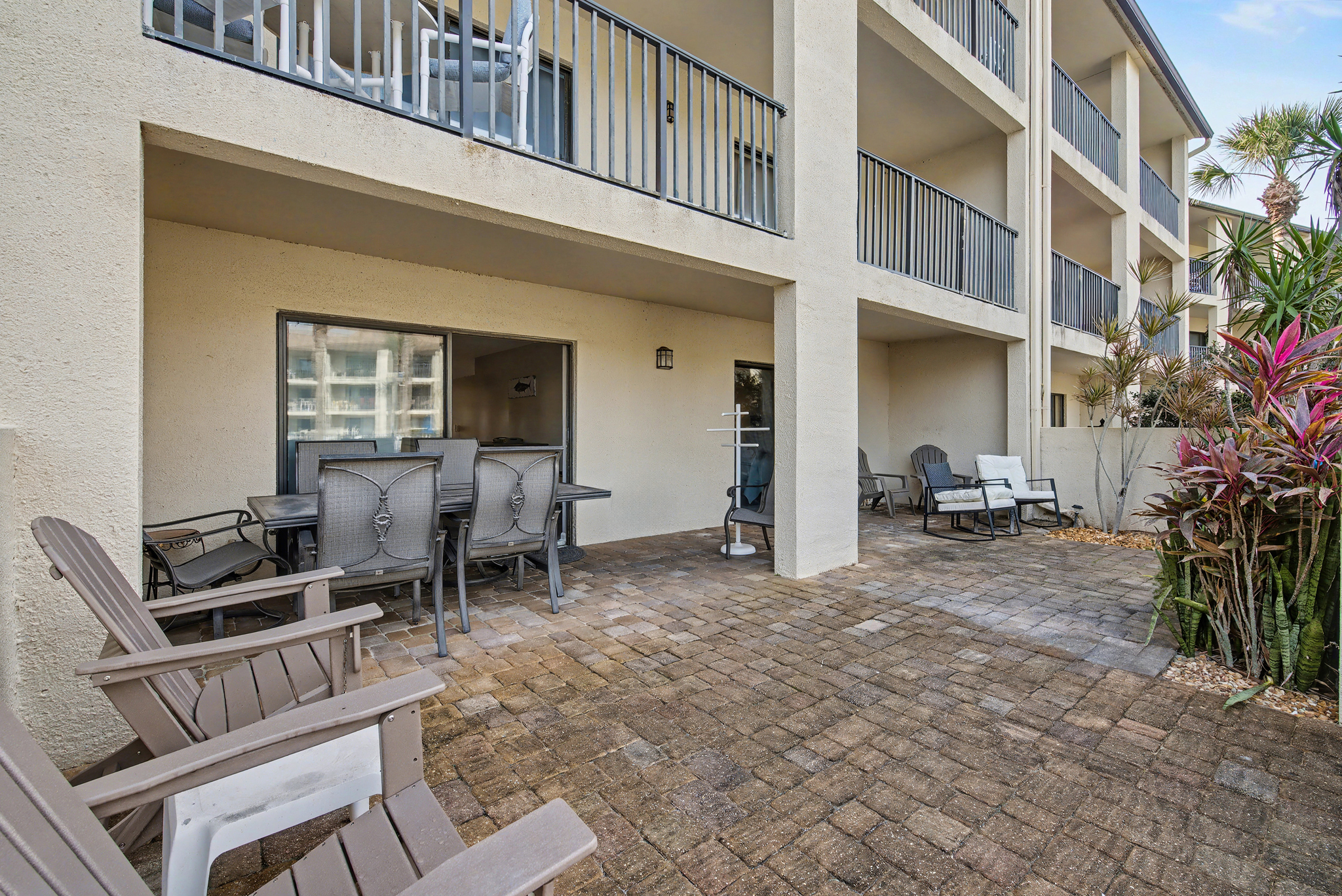 Overall it was a great week of vacation. The property was clean. The beds were not very comfortable for us but may be for someone else. The couches were very uncomfortable for us, we both have bad backs and they were very soft with poor back supports. The room was right next to the pool and courtyard which were beautiful. The beach was a bit of a walk but no properties are directly on the beach because of the dunes. Kitchen utensils and cookware were more than adequate. shopping and dining close by. Only wish would have been some beach chairs. there were 2 in the shed and 1 was broken. if ur staying here take your own. Washer and dryer on site and worked well.